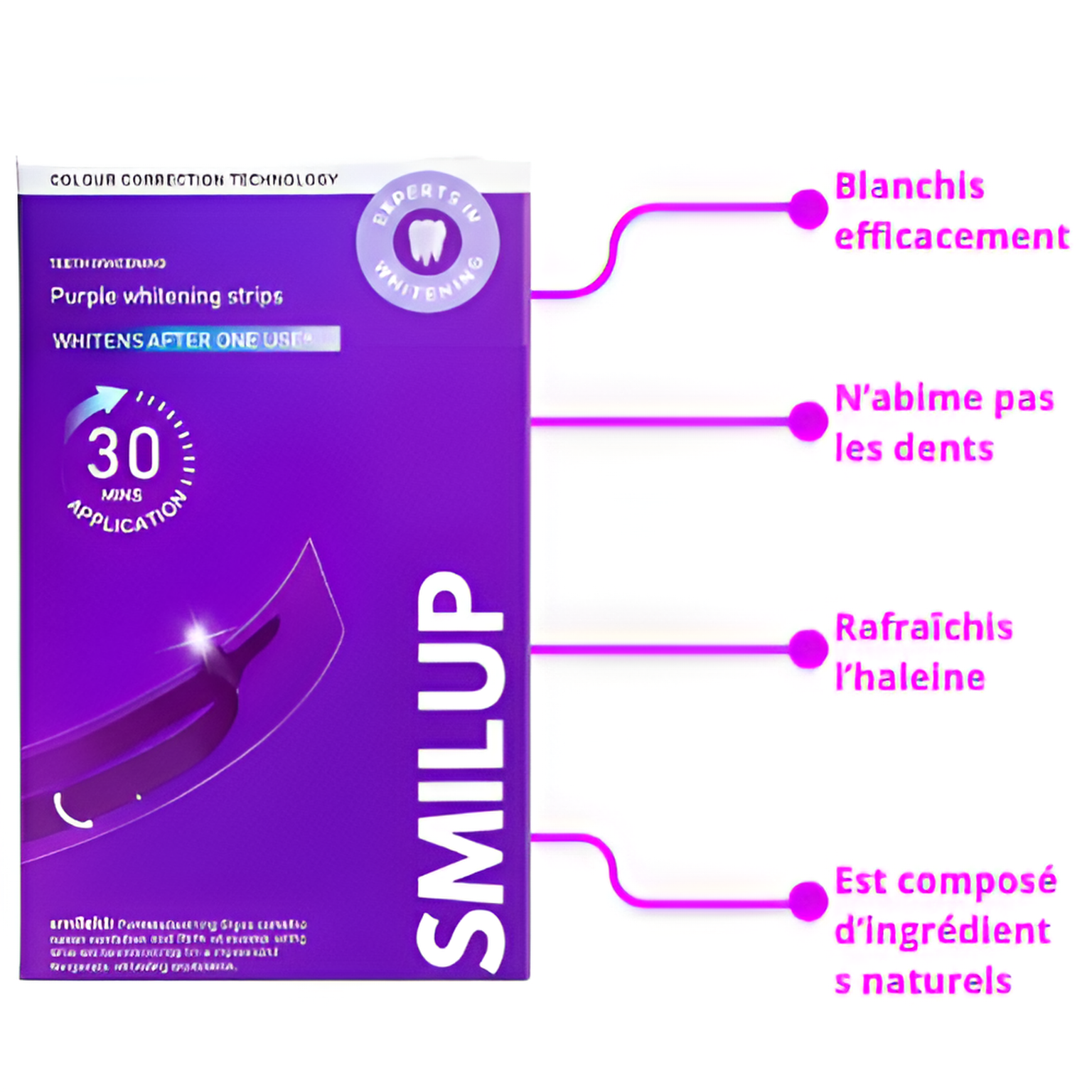 La formule SmilUp, développée pour respecter l’émail, cible les taches du quotidien et agit progressivement pour révéler la blancheur naturelle du sourire.